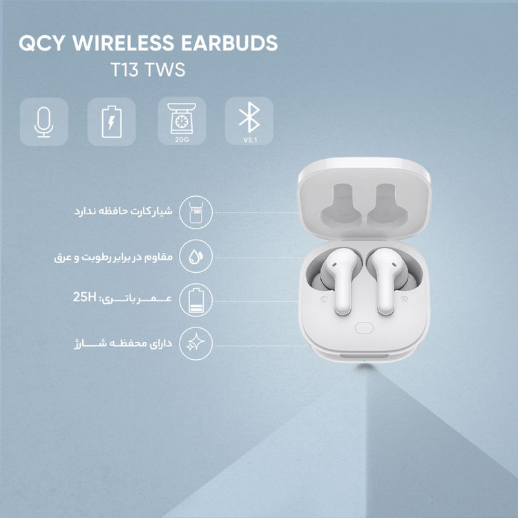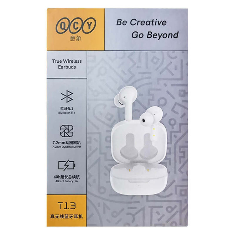 هندزفری بیسیم QCY T13 از طراحی داخل گوش و جذابی بهره میبرد. درایور 7.2 میلیمتری دینامیک آن صدای شفاف و هیجانانگیزی را تولید و ماژول بلوتوث 5.1 اتصال سریع و پایداری را میسر میکند. باتری هندزفری و کیس مجموعا 40 ساعت شارژدهی را به کاربر ارائه میدهند. هندزفری بیسیم QCY T13 از طراحی داخل گوش بهره میبرد و با رنگ سفید به بازار عرضه شده است. شیائومی در طراحی این هندزفری اصول ارگونومی را رعایت کرده است و زاویهای که بین قسمت سری و پایه هندزفری وجود دارد باعث میشود تا به شکل بهتری درون گوش قرار بگیرد. بر روی قسمت پایه هندزفری دو پین طلایی رنگ وجود دارد که برای شارژ باتری مورد استفاده قرار میگیرد. علاوه بر این، برای طراحی کیس شارژ این هندزفری از کپسولهای فضایی الهام گرفته شده است و شاهد خطوط نرم و زبان طراحی مدرن و جذابی هستیم. این هندزفری همچنین از قابلیت شارژ فوری نیز پشتیبانی میکند. با این قابلیت با 5 دقیقه شارژ کردن باتری هندزفری میتوانید تا 1 ساعت از پخش موسیقی لذت ببرید.